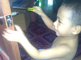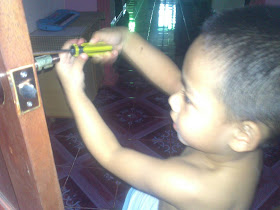 Masa Abah dia kata nak tukaq tombol pintu, dia pun sibuk la ambik peralatan nak tolong Abah..hi hi..