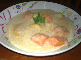 Pastu kacau supaya santan x pecah minyak. Bila dah mendidih dan labu + keledek tu dah empuk masukkan sagu dan masak hingga sagu nampak jernih.. Siap!